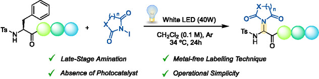 An efficient protocol for the modification of phenylalanine-containing peptides is developed. The tandem debenzylation–amination process in N-terminal phenylalanine short peptides with N-iodoimides proceeds under visible-light irradiation and metal-free conditions. This method broadens the available chemical toolbox for the modification of Phe and allows the incorporation of N-containing heterocycles into peptide settings.