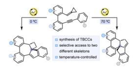 Divergent synthesis of two polycyclic frameworks containing tricyclic bridgehead carbon centers by gold-catalyzed cycloisomerization of o-cyclopropylidenemethyl-o′-alkynylbiaryls.
